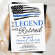The Legend Has Retired! Thin Blue Line Police Retirement Invitations . Celebrate years of dedicated service, and invite friends and family to your law enforcement retirement party with this Thin Blue Line Flag Police Retirement Invitation. USA American flag design in Police Flag colors, modern trendy black white and blue design. See our collection for matching police officer retirement gifts, police retirement party favors, and supplies. COPYRIGHT © 2021 Judy Burrows, Black Dog Art - All Rights Reserved. Police Retirement Personalized Legend Has Retired Invitation