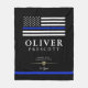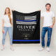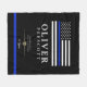 A custom police officer anniversary-themed tall black fleece blanket tailored to law enforcement. The thin blue line and police flag is representative of American Police and personnel.