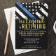 This design features a police force flag with black and white stripes, and a thin blue line stripe as well. "The Legend is Retiring" gold text sits above all of the party details for the retiring law enforcement officer, sheriff, captain, or chiefs retirement party details.
