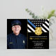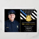 This design features a police force flag with black and white stripes, and a thin blue line stripe as well. The police badge and gold text sits above all of the party details for the retiring law enforcement officer, sheriff, captain, or chiefs retirement party details. Customise this design even further with the photo of the retiring police officer.