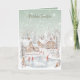 Polish Christmas card - Christmas winter scene with snow covered conifer trees near the frozen pond set against a pale green background with sparkling stars. The Polish text in front of the card says: Polish Holidays. Inside in Polish too: Merry Christmas and a happy New Year