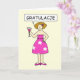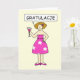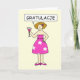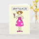 A cartoon lady standing on a large cake saying 'Gratulacje', which means 'Congratulations' in Polish. The image has a lemon colored background.