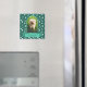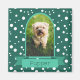 Frame a vertical photo of your pet in a classic arch frame in teal with a banner for his or her name. Background is white polka dots on teal.