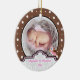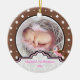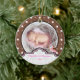 Polka dot bird label baby girl 1st Christmas custom ornament, featuring a photo of your precious angel, brown polka dot pattern with lavender purple dots, a cute pink bird and the name of your baby in a damask label with black and pink outline. Also works great as a keepsake for kids birthdays and other occasions too.