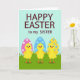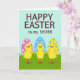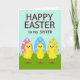 Designed with a pale blue background, this Easter card opens with deep crimson text across the top that reads “HAPPY EASTER to my SISTER,” with the first words larger and the rest tucked neatly beneath. Below the lettering, three small yellow baby birds stand side by side, their tiny orange beaks and feet turned slightly towards one another as if sharing a friendly moment. Each bird has a simple dark eye and a soft, content look that adds a gentle, caring tone to the scene. Behind them sit three large egg shapes like seasonal decorations, arranged in a row to frame the birds. The left egg is pink with white polka dots, the middle egg is light blue with darker blue dots, and the right egg is yellow with light blue spots, keeping a cheerful pattern throughout 🌷. Along the bottom, a wavy strip of rich green grass anchors the birds and eggs like a small spring meadow 🐰. The eggs rise above the grass in smooth ovals, with evenly spaced dots that echo across all three colours.