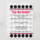An invitation featuring a black and white polka dot background with hot pink trim. Opposite side features matching pink circle shaped frame with text "You Are Invited." Personalise the text with details of your occasion.