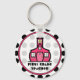 A keychain featuring a black and white polka dot background. Logo of Pink Schoolhouse inside a hot pink frame. Customisable text reads "First Grade Teacher"