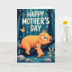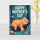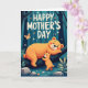 Designed with a dreamy woodland scene, the card shows two friendly bear-like animals sharing a tender moment in a quiet forest ❤️. A larger, sturdy figure lounges on a thick, dark branch, wearing a gentle smile with rosy cheeks and a relaxed posture that feels warmly protective. Below, a smaller cub stands on the forest floor, stretching its little arms upward as if asking for a hug or trying to touch the one above. The characters are shaded in a soft orange glow that stands out against deep teal and indigo tree trunks and shadowy leaves, giving the scene a cosy, tucked-away feel. A few small flowers in white and soft orange dot the lower areas, adding a sweet, caring touch 🌼. Near the top, a short Mother’s Day message sits centred in creamy white lettering, with the words spaced to breathe against the darker background. A single butterfly floats near the wording, and the forest textures look gently brushed with layered colour. The branch curves across the upper half while tall trunks rise behind it in cool blues and greens.