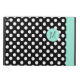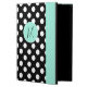 Stylish iPad Air 2 folio style case with built in stand done in a black and white polka dot. A mint green band, running down the right front edge and a decorative mint green disc, on the middle front, has a black one letter monogram ready to personalise. Makes a great personalised gift idea.