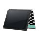 Stylish iPad Air folio style case with built in stand done in a black and white polka dot. A mint green band, running down the right front edge and a decorative mint green disc, on the middle front, has a black one letter monogram ready to personalise. Makes a great personalised gift idea.