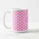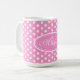 Modern girls bright pink polka dot patterned mug. Perfect for personalising your drink or a great gift for a friend as a Christmas or birthday gift for a woman or teen girl. Personalise with your own choice of name and initial. This example reads: Maxine K. Design by Sarah Trett.