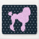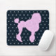Very fuzzy light pink poodle applique on a dark blue with white polka dots fabric background. Cute retro 50s style design.