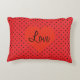 Show the love with this whimsical accent pillow. There's a red background with black polka dots. In the centre of the pillow there is a red heart, with the word Love.