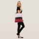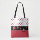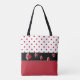 Cute all over print tote bag done in a red on white polka dot pattern, across the top, and a red on red polka dot pattern, across the bottom half. A black band, runs across the middle of the bag, is decorated with a line of black and red ladybugs. Personalise the black text to read what you want.