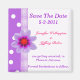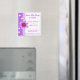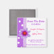 Whimsical Spring inspired graphics, in tones of purple, white, and pink. A pretty lavender flower sits on a gingham ribbon with a polka dot background, on the left side of the magnet. Personalise this great Save the date magnet with your names and information. The perfect marriage announcement for a Spring or Summer wedding.
