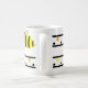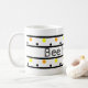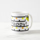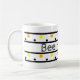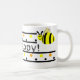 Bee Happy is written in a fun font. A smiling yellow hand-painted black striped bumble with fluttering wings is buzzing by to say hi. Colourful geometric shapes with black stripes and orange yellow polka dots on white background. Bright and cheerful mugs. Original artwork design © TamiraZDesigns. www.zazzle.com/tamirazdesigns