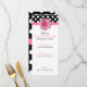 Stylish wedding reception menu done in white, with a black and white polka dot pattern, on the top and covering the back of the invitation. Graphics of a pink ribbon, with a pink Gerber daisy decorates the middle of the ribbon. Text in black and pink is ready to personalise for your wedding reception. Pretty menu with a whimsical touch.