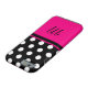 At the top of the case, a black background with white polka dots, at the bottom, a bold modern pink with a customisable monogram