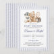 Celebrate your little boy in style with this charming preppy baby shower invitation. The design features a sweet watercolor teddy bear surrounded by classic elements—a plaid hot air balloon, a tennis racket, and a wrapped gift—bringing together a timeless Ralph Lauren inspired look. The soft navy striped border frames your personalised details, while the clean white background and elegant mix of fonts create a sophisticated yet playful presentation.