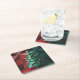 This coaster features a geometric, modernist painting of a Christmas tree composed of angular, triangular shapes in shades of green and red. The tree is decorated with spherical ornaments in pink, red and gold, as well as diamond-shaped ornaments in white, pink and gold. The background features a bold geometric pattern with triangular segments in red, forest green and lime green. The tree is rendered in various shades of emerald and forest green, creating a three-dimensional effect through overlapping triangular planes. The ornaments are arranged in a symmetrical pattern along the tree's branches, with larger baubles at the top and smaller ones descending. The coasters are paperboard coasters. The dimensions are 4" by 4". There are six coasters in the set. The coasters are tough, durable and absorbent.
