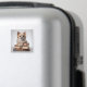 A realistic illustration of a light tan and white Pomchi (Pomeranian/Chihuahua) dog sitting atop a stack of vintage leather-bound books.