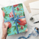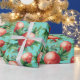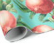 Colourful pomegranate fruits with green leaves on a light teal background.
