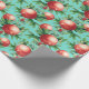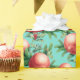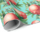 Colourful pomegranate fruits with green leaves on a light teal background.