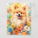 Colourful watercolor artwork of a Pomeranian sitting in a field of spring flowers.