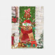 Pomeranian Dog Christmas sitting outside decorated home with Christmas wreath, Christmas tree is a perfect Christmas gift idea for dog lovers.