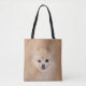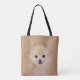 Cute orange or fawn Pomeranian face with a matchingly coloured wood background dog lovers tote bag