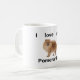 A mug with the words " I love my Pomeranian" with a picture of a Pomeranian in the centre, Its part of a series of mugs that help people express their love for their dog