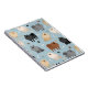 Cute Pomeranian dogs in black, grey, cream, chocolate and red coats sit and stand with scattered dog bones and paw prints on a light blue background.