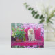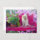 Send a smile with this charming Pomeranian puppy postcard. Featuring a fluffy Pomeranian seated on a rustic fuchsia pink bench surrounded by lilac flowers and a terracotta planter, the vibrant garden scene makes a cheerful card for any occasion. Perfect for Pomeranian lovers, floral fans, or anyone who enjoys colourful and uplifting correspondence.