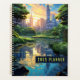 This planner features a vibrant illustration of a pond in a city park. Lily pads float on the blue water and pink flowers bloom along the water's edge. Tall green trees and grasses add to the park setting. In the distance, tall buildings reach towards the sky, which is aglow with sunlight. The design is the same on the front and back covers. Personalise the front with the current year.