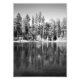 Digital black and white photo of ponderosa pines reflection on a still pond in Lassen Volcanic National Park in California.