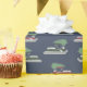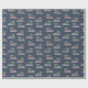 This patterned wrapping paper is perfect for Christmas. The gift wrap features illustrations of pontoon boots with a Christmas tree on top set against a navy blue background.