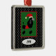 Black fancy groomed poodle with Santa cap, black and white polka dot background and customisable date are all combined on this adorable keepsake ornament