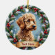 A beautiful, ultra-detailed Christmas ornament design featuring a realistic portrait of the breed centered within a soft, festive winter frame. This elegant design includes pine branches, red berries, and snowflakes against a snowy backdrop, illuminated by warm holiday lighting. The balanced, round composition includes clear space below the dog for customization.