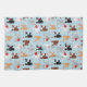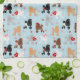 Cute Valentine's Day Poodles with in black, white, gray, apricot and brown color coats wearing red, pink, and white polka dot and heart sweaters with scattered paw prints and arrow on a blue background.