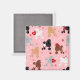 Cute Valentine's Day Poodles with in black, white, grey, apricot and brown colour coats wearing red, pink, and white polka dot and heart sweaters with scattered paw prints and arrow on a pink background.