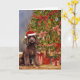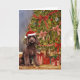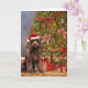 This Christmas card features a watercolor portrait of a brown poodle wearing a Santa hat sitting under a Christmas tree.