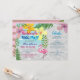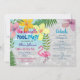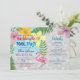 Trendy, modern fun pool Bachelorette party invitation with cute flamingo, custom itinerary and colourful watercolor flowers, and palm leaves.