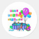 Colourful and fun Pool Party 7th Birthday design featuring hot pink, blue, green, and orange text that reads "Pool Party Birthday", kids swimming in a pool, beach toys, and lots of birthday balloons, the biggest of which has a number 7 on it!