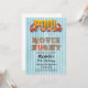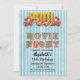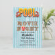 Make a splash with this fun blue striped invitation combining a pool party and movie night theme, perfect for a 14th birthday celebration. Featuring bold retro marquee letters, lifebuoy accents, and a cute popcorn graphic, this design sets the scene for an unforgettable evening of swimming and cinema under the stars. Personalise with your details for a unique birthday invite!