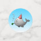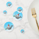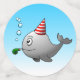Cute illustration of a little whale on table confetti. The whale is wearing a red and white striped party hat and has started the birthday party.