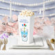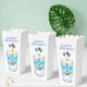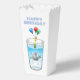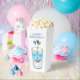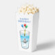Pool party birthday popcorn favour box with a cute illustration of a little whale. The whale is wearing a red and white striped party hat and has started the birthday party which takes place in a filled water glass.