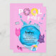 Celebrate an upcoming birthday with a splash! This invitation features pool items (goggles, swimsuit, flip flops, ball, swimsuits, and floats) that surround a splash of water. Inside the splash of water are the details of the invite.