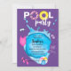 Celebrate an upcoming birthday with a splash! This invitation features pool items (goggles, swimsuit, flip flops, ball, swimsuits, and floats) that surround a splash of water. Inside the splash of water are the details of the invite.
