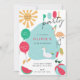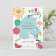 A kid's birthday party invitation featuring a flamingo, Unicorn float, Balloon, sun, Pool, Popsicles.