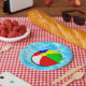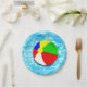 Summer swimming party design, featuring a beach ball in a cool pool. Add text to personalise.